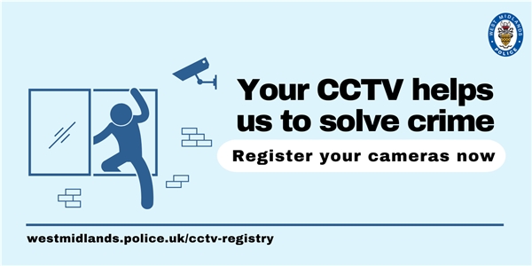 Register your CCTV and doorbell cameras with us today to receive alerts when your footage may help us catch criminals operating in your area. NO personal information will be publicly available. It takes just 60 seconds to add your details to our secure police system and within minutes, you could be helping us solve serious crimes. You’ll just add your name, address, email and the number of cameras you control. There’s still time for you to securely register your CCTV or doorbell cameras before the new year at: CCTV Registry | West Midlands Police