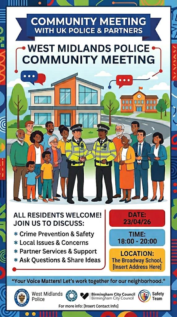 Tomorrow, on Thursday 24th April 2026, the Aston Neighbourhood Policing Team are hosting a community meeting at THE BROADWAY ACADEMY, THE BROADWAY, PERRY BARR, B20 3DP.