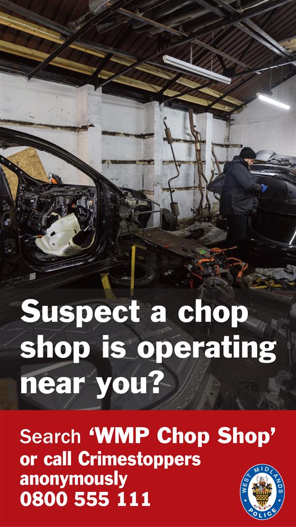 We need your help to rid the West Midlands of illegal ‘chop shops’. These dangerous places encourage car theft. Stolen cars are sold on to ‘chop shops’ where they are then stripped for parts. Chop shops are putting lives at risk, creating a demand for stolen cars, and damaging the reputation of legitimate salvage yards.