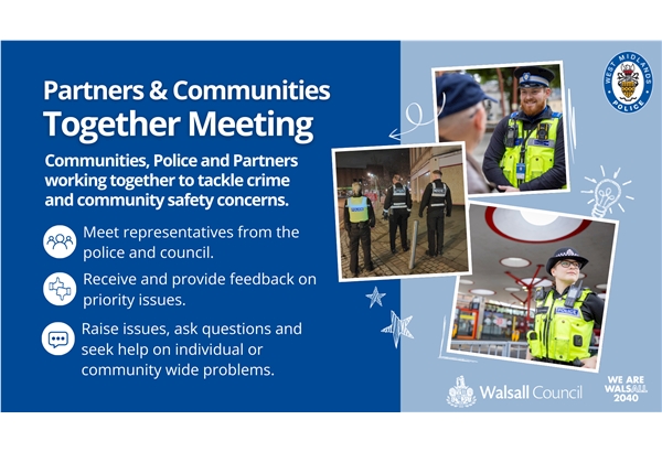 St Matthew's Policing Team and Walsall Council Community Safety Team would like to invite you to join them at the next Partner & Communities Together meeting to discuss policing matters including crime and community safety in your area.